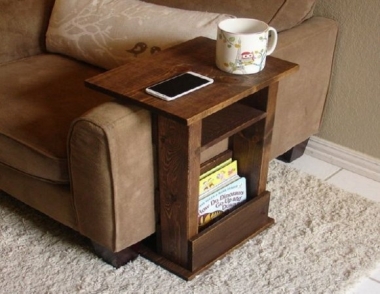 Ένα βοηθητικό ξύλινο τραπεζάκι με μικρά ράφια για το μπράτσο του καναπέ σας, εύχρηστο και βολικό για να απολαμβάνεται τον καφέ σας, διαβάζοντας το αγαπημένο σας περιοδικό.