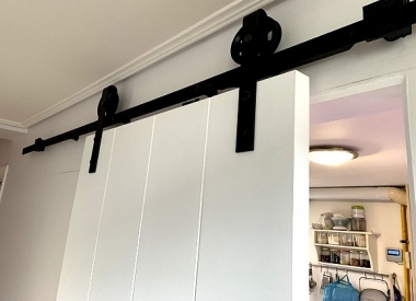 Συρόμενη πρεσαριστή πόρτα από κόντρα πλακέ θαλάσσης σημύδα, τραβηγμένες κινισιές και μηχανισμό αχυρώνα. Βαμμένη με οικολογικό χρώμα.