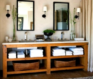 Ξύλινο έπιπλο μπάνιου από σουιδικό ξύλο με μαρμάρινο πάγκο, δύο ένθετους νιπτήρες , ξύλινα ράφια για τις πετσέτες, περασμένο με υδατοδιαλυτά βερνίκια και διακοσμημένο με καρόβιδες. Ιδανική λύση για αποθήκευση στο χώρο του μπάνιου.