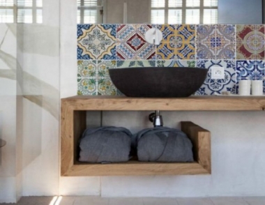 Ξύλινος πάγκος μπάνιου από κόντρα πλακέ θαλάσσης , επενδυμένος με καπλαμά πεύκο, περασμένο με υδατοδιαλυτά βερνίκια. Μια μοντέρνα άποψη γα το μπάνιο σας.