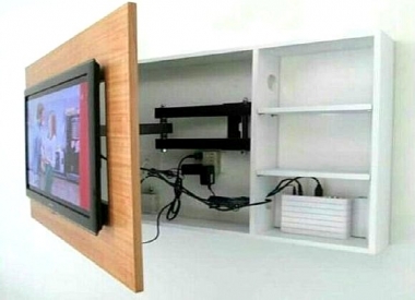 Κουτί από λευκή μελαμίνη με ράφια για την τοποθέτηση των καλωδίων, πλαίσιο από mdf επενδυμένο με καπλαμά δρυς βαμμένο με οικολογικό βερνίκι. Μια πολύ έξυπνη και χρηστική λύση .