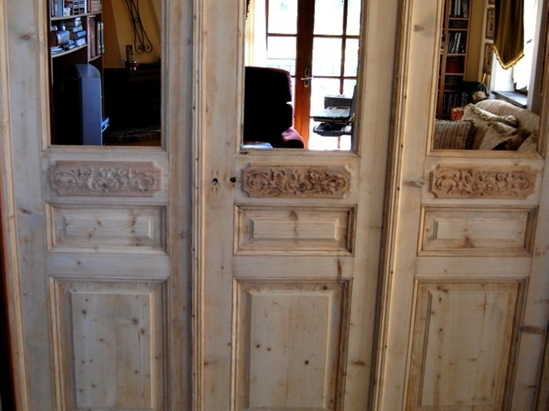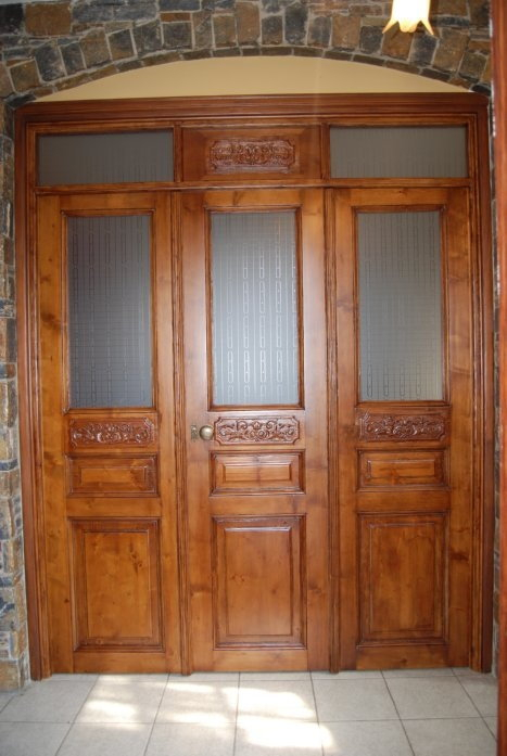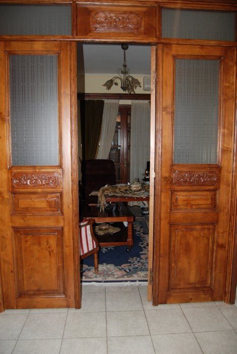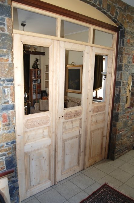 Αναπαλαίωση ξύλινης τρίφυλλης ταμπλαδωτής πόρτας, κατασκευής 1947, με ανάγλυφα σχέδια στους ταμπλάδες, ανοίγματα για τζάμια και σταθερούς ξύλινους φεγγίτες.