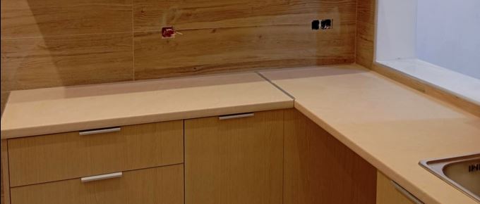 Ντουλάπια κουζίνας με πορτάκια ημιμασίφ από δεσποτάκι, βαμμένα με βαφή ντεκαπέ, χειροποίητη διακοσμητική κορνίζα τύπου Μαίανδρος, μαρμάρινο τραπέζι με διακοσμητικές χειροποίητες κολώνες από κόντρα πλακέ θαλάσσης σημίδα επενδεδυμένο με καπλαμά δεσποτάκι