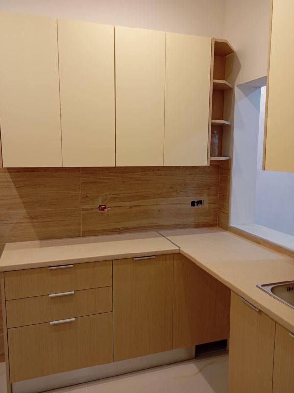 Δίχρωμη κουζίνα από μελαμίνη σε 2 αποχρώσεις, πορτάκια Ακρίτας δρυς τα κάτω και μονόχρωμα μπεζ τα κρεμαστά με διακοσμητικά ραφάκια. Κουτιά από λευκή μελαμίνη , συρτάρια με μηχανισμούς eurofit, πυρίμαχο πάγκο και πάτος προστασίας ντουλαπιών (υγροσυλλέκτης).
