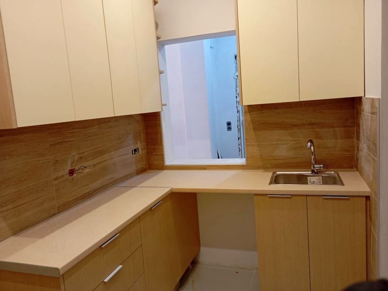 Ντουλάπια κουζίνας από μελαμίνη σε 2 αποχρώσεις, κρεμαστά στο χρώμα του ξύλου με κάθετα νερά και τα βάσεως στο χρώμα της μέντας. Ανοιγόμενα πορτάκια, πυρίμαχο πάγκο, συρτάρια με μηχανισμούς blum και κουτιά από λευκή μελαμίνη.