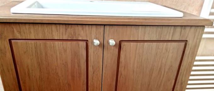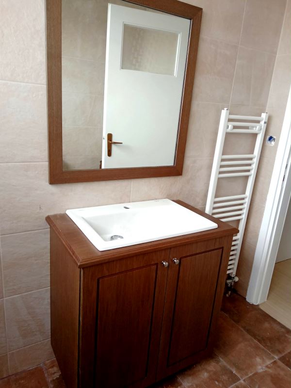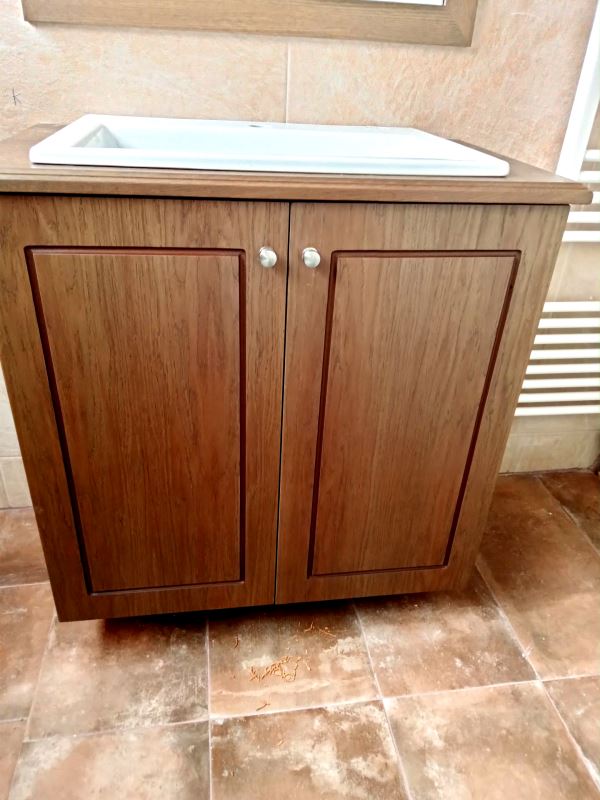 Ντουλάπι μπάνιου από κόντρα πλακέ θαλάσσης επενδυμένο με καπλαμά δρυς, πορτάκια ημιμασίφ με πλαίσιο από ξύλο δρυς, με μεντεσέδες blum με φρένο, βαμμένο με υδατοδιάλυτα οικολογικά βερνίκια.