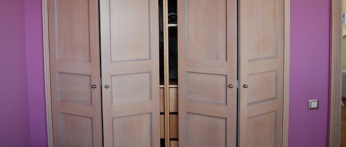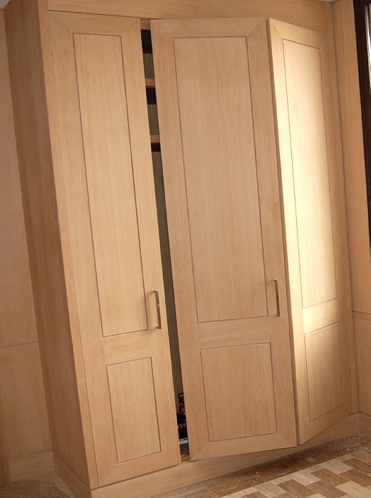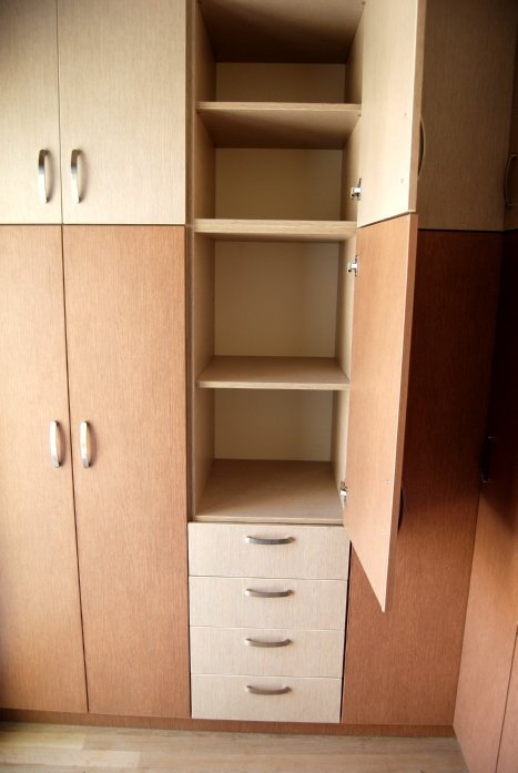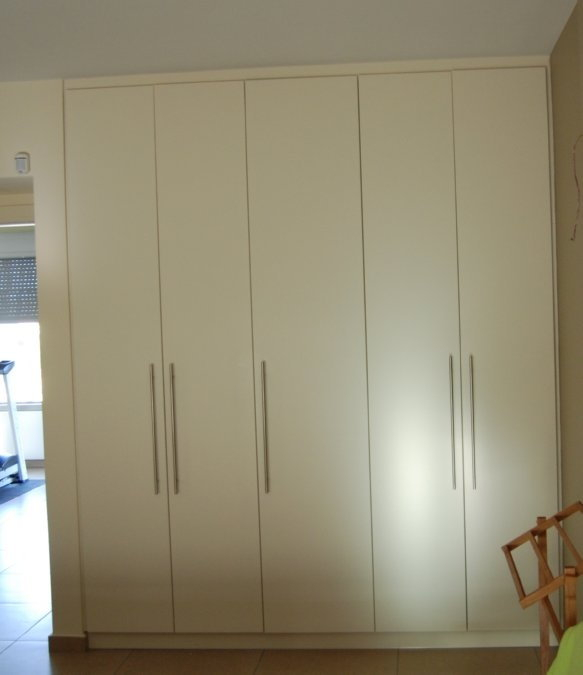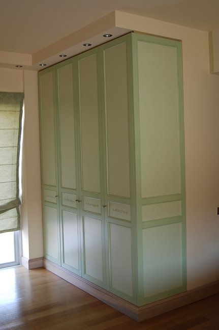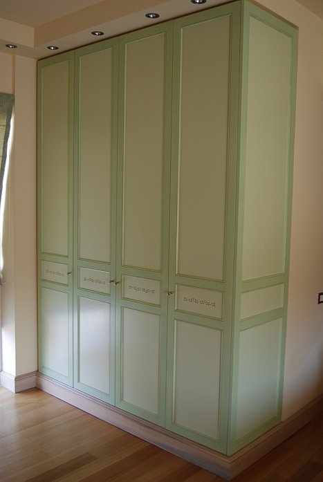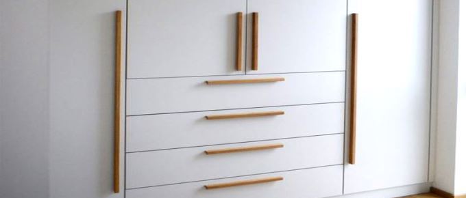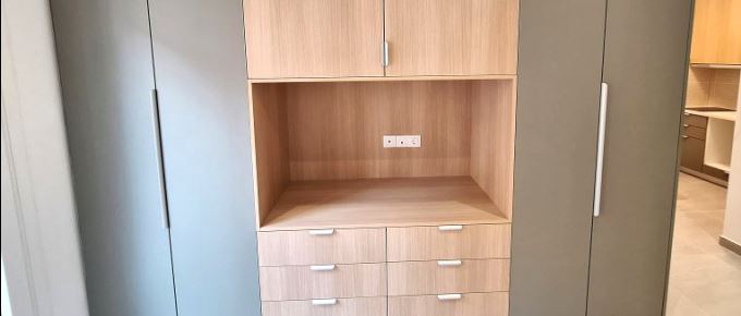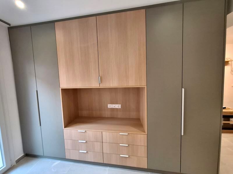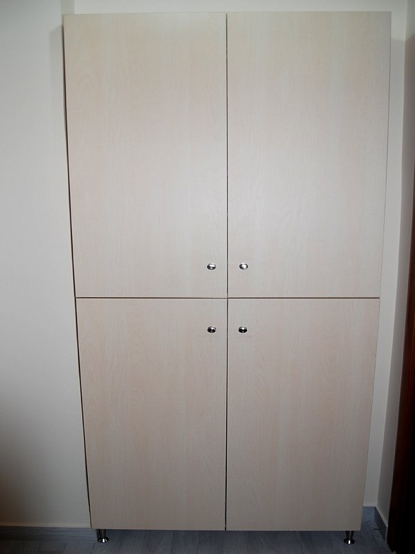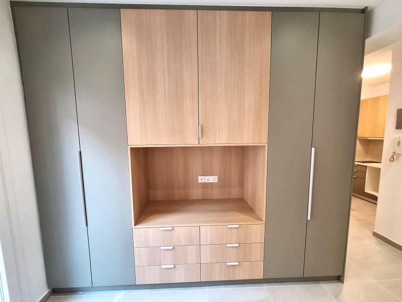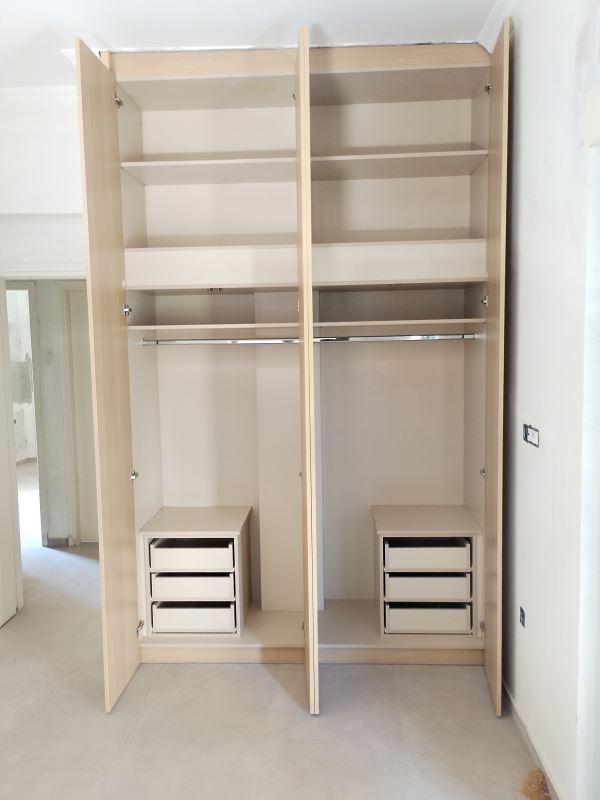 Ανοιγόμενη τετράφυλλη ντουλάπα, λακαριστή με οικολογική λάκα, αποτελούμενη από τέσσερα εξωτερικά συρτάρια με μηχανισμούς grass για αθόρυβη λειτουργία κύλισης, χειροποίητα ξύλινα πόμολα από κόντρα πλακέ θαλάσσης σημύδα.