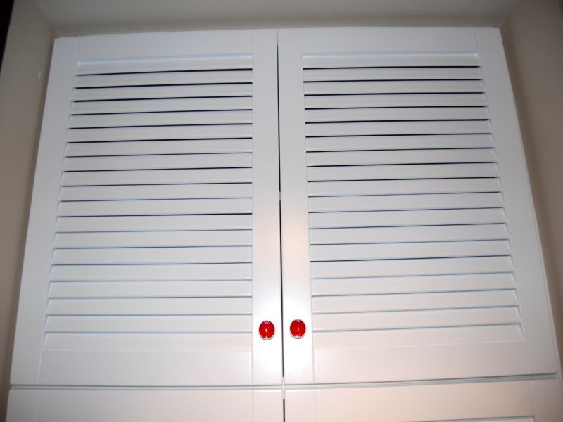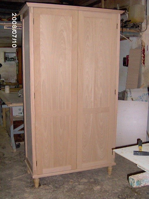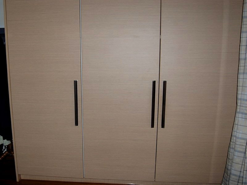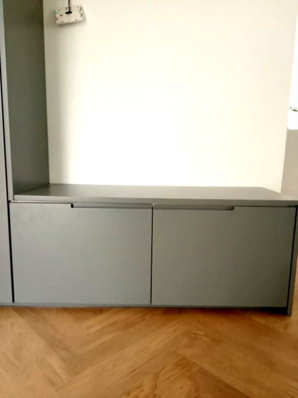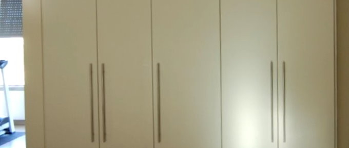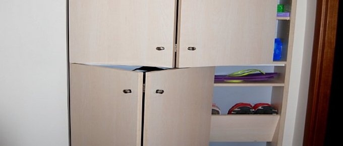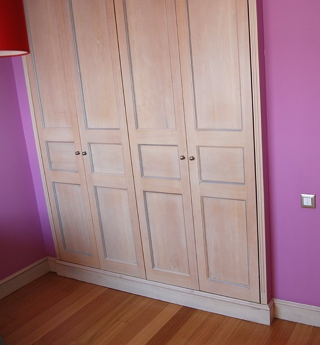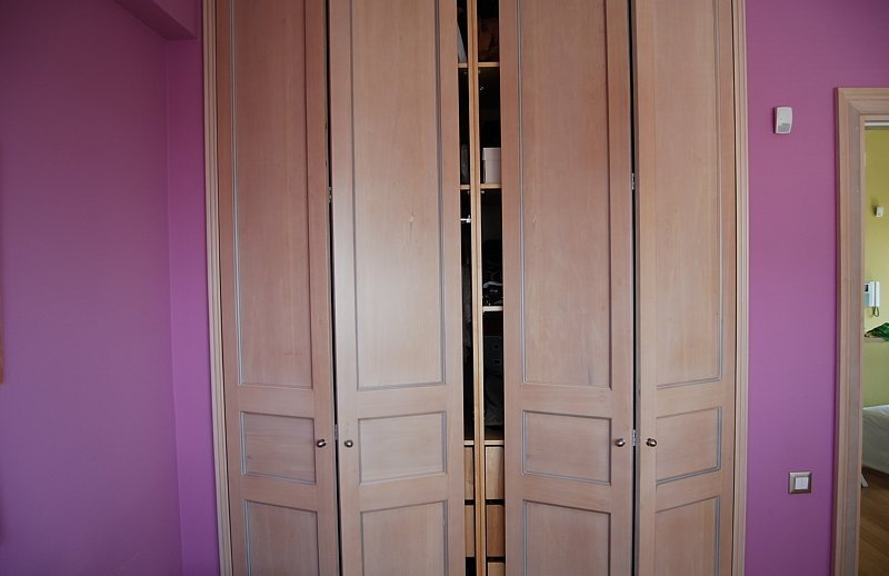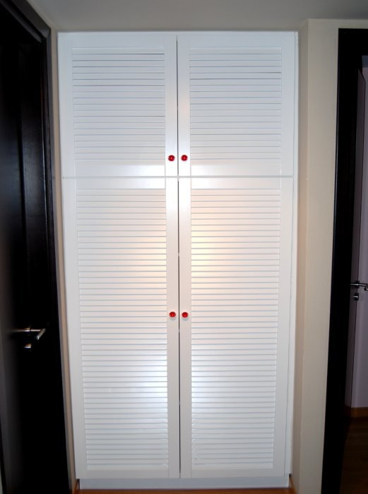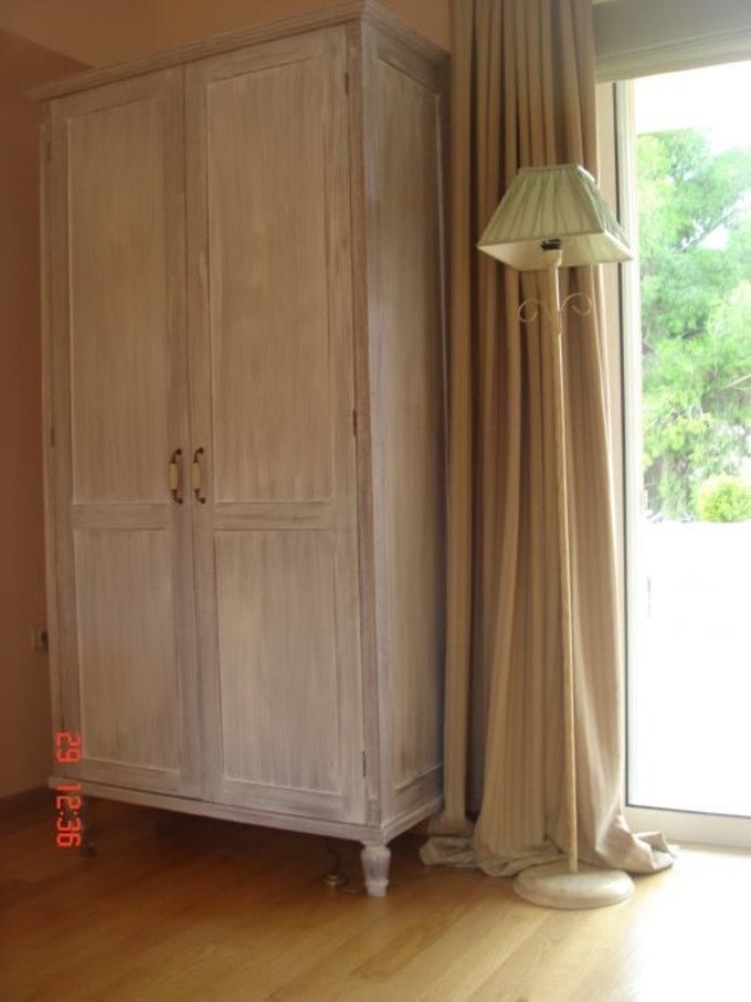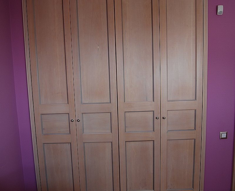 Ανοιγόμενη τετράφυλλη ντουλάπα, λακαριστή με οικολογική λάκα, αποτελούμενη από τέσσερα εξωτερικά συρτάρια με μηχανισμούς grass για αθόρυβη λειτουργία κύλισης, χειροποίητα ξύλινα πόμολα από κόντρα πλακέ θαλάσσης σημύδα.