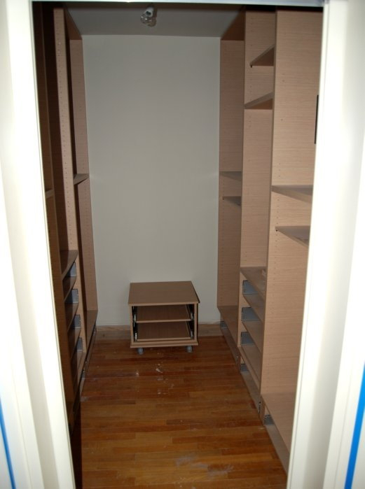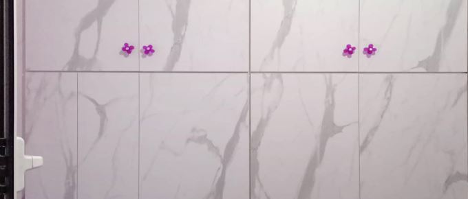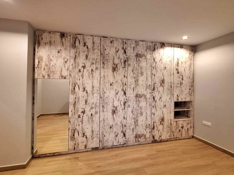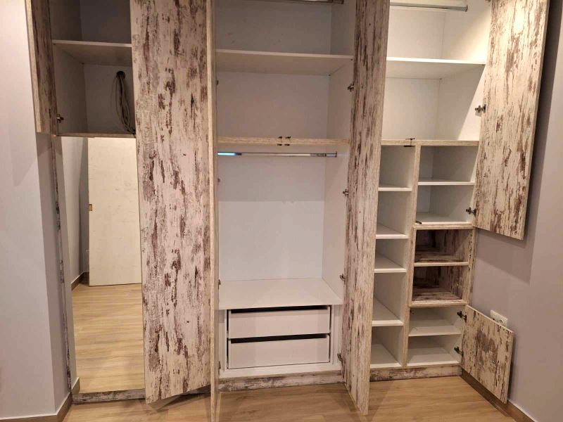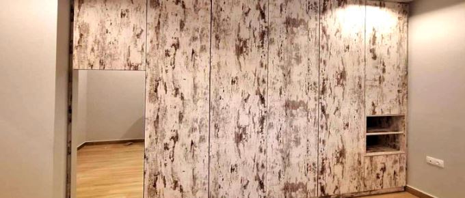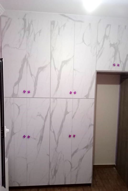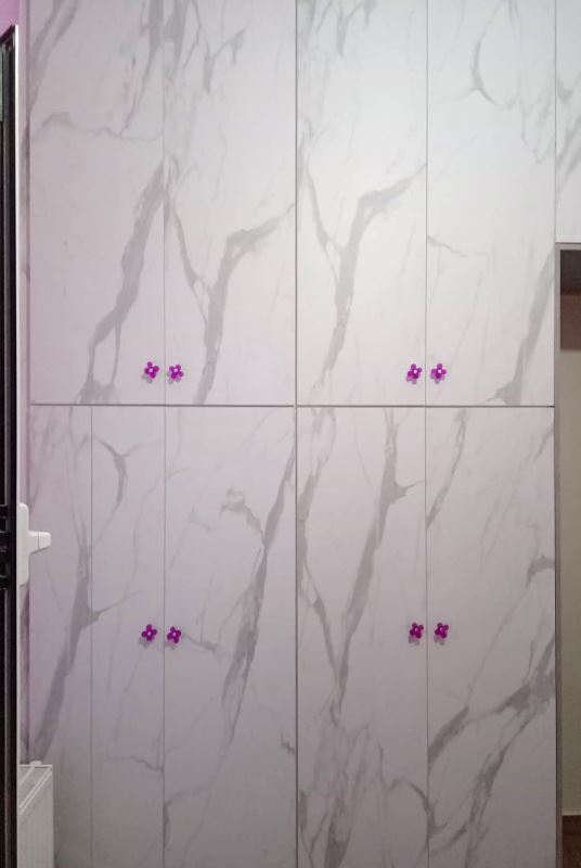 Τετράφυλλη ανοιγόμενη ντουλάπα μελαμίνης, ιδιαίτερη, σε σχέδιο μαρμάρου με αποθηκευτικό ντουλάπι πάνω από την πόρτα, λευκά κουτιά μελαμίνης, μεντεσέδες blum, ράφια, σωλήνες, και ασανσέρ στο εσωτερικό της.