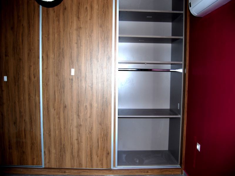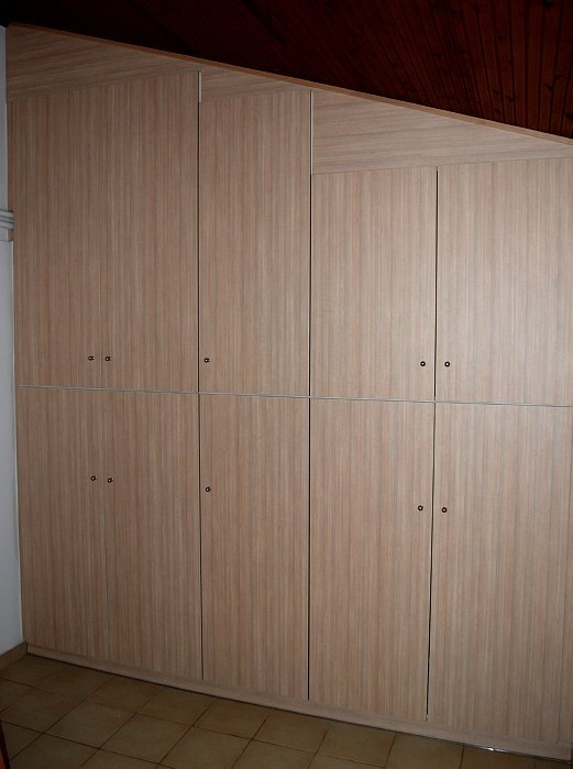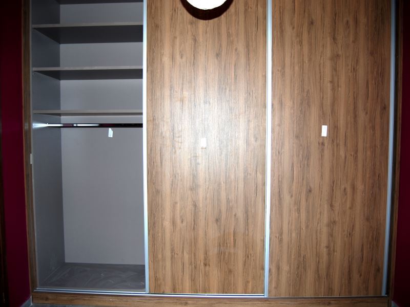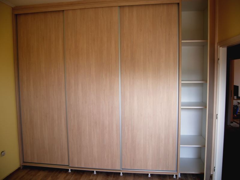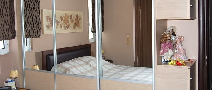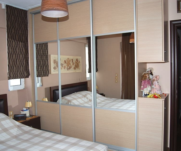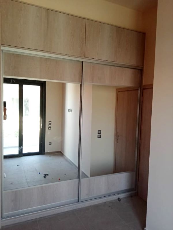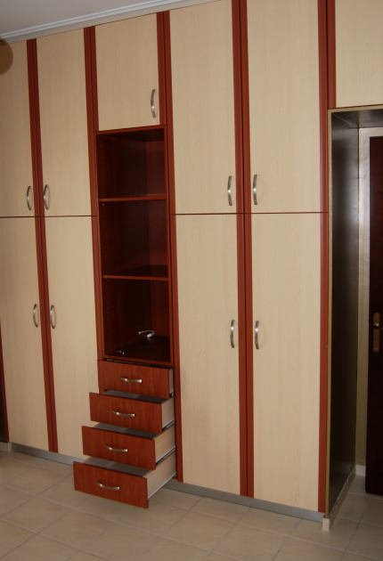 Κατασκευή ντουλάπας με έγχρωμα συρόμενα μελαμινικά πορτάκια ΑΚΡΙΤΑΣ και πατάρι με ανοιγόμενα πορτάκια. Καθρέφτες σε πλαίσιο αλουμινίου και κουτιά από λευκή μελαμίνη , αποτελούμενη από συρτάρια, ράφια και ασανσέρ.
