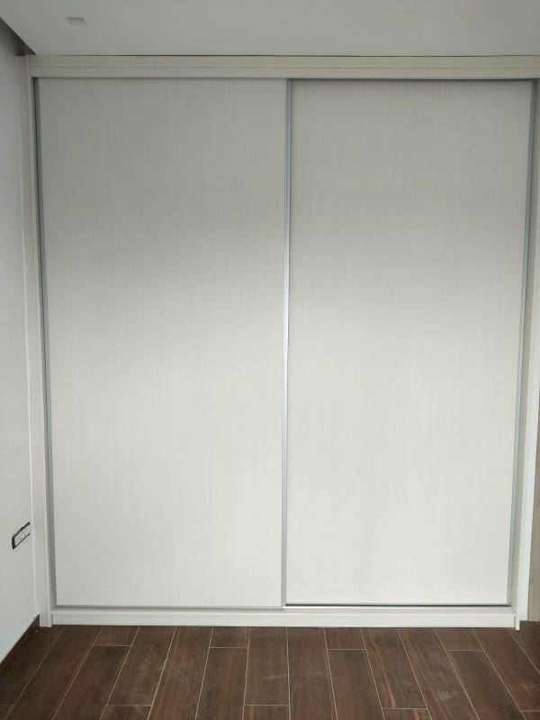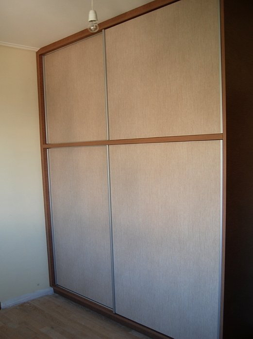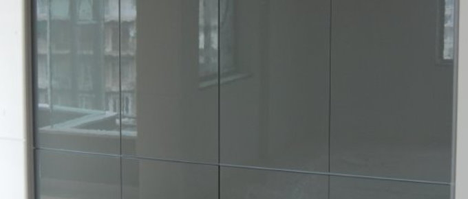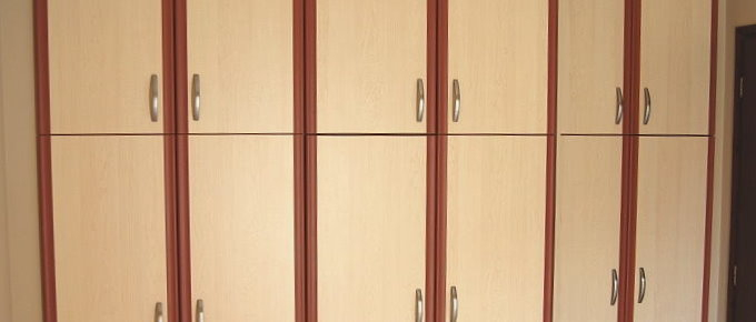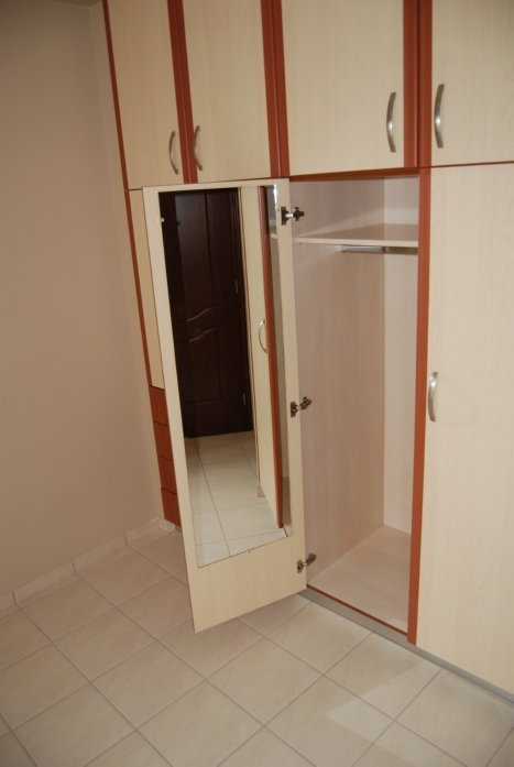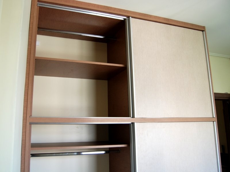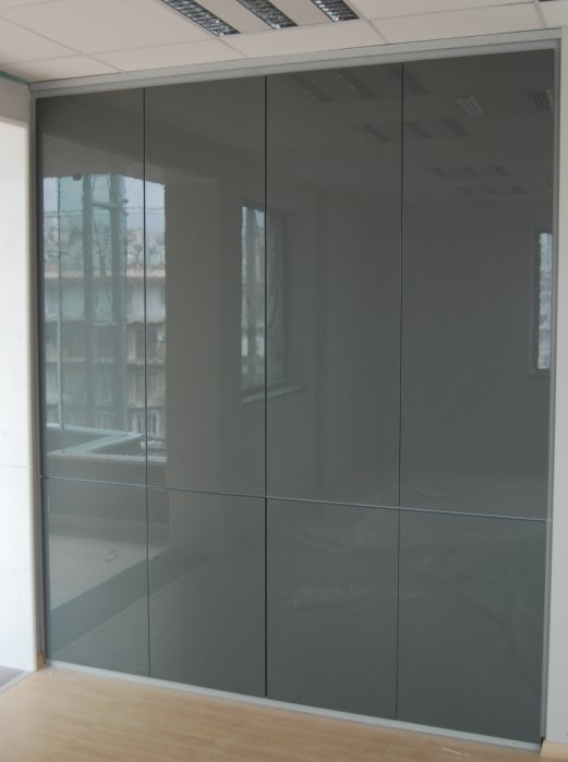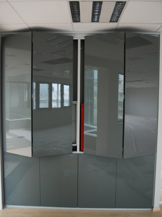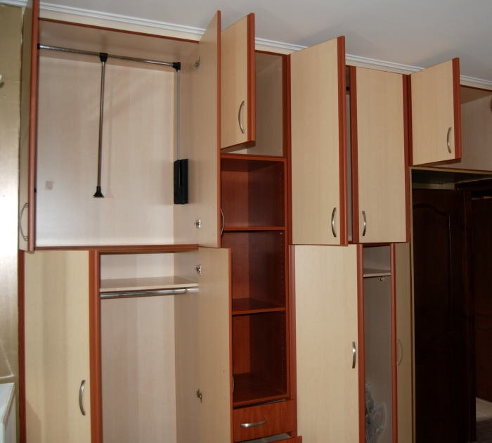 Κατασκευή ντουλάπας με έγχρωμα συρόμενα μελαμινικά πορτάκια ΑΚΡΙΤΑΣ και πατάρι με ανοιγόμενα πορτάκια. Καθρέφτες σε πλαίσιο αλουμινίου και κουτιά από λευκή μελαμίνη , αποτελούμενη από συρτάρια, ράφια και ασανσέρ.