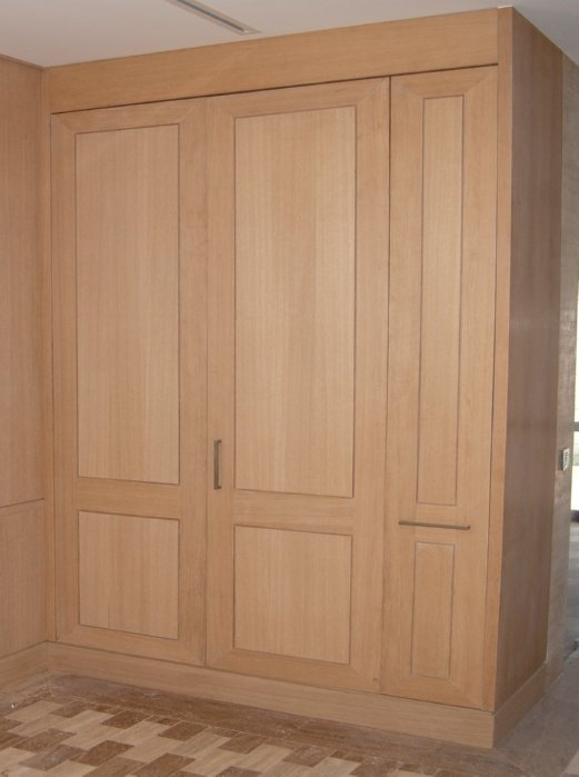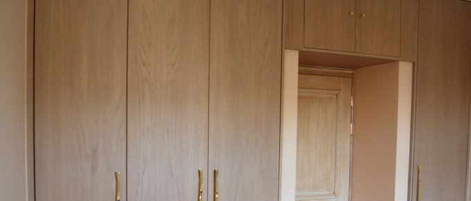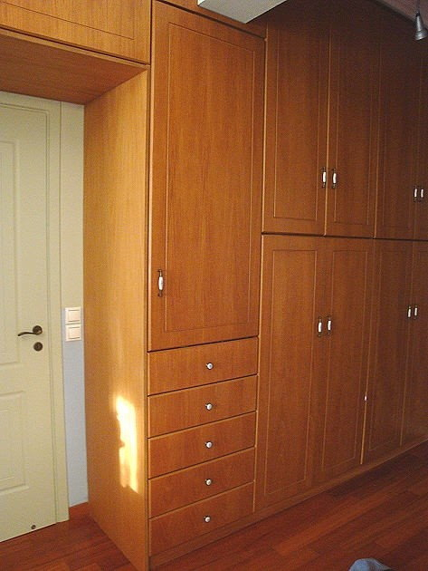 Δρύινη μοντέρνα ντουλάπα με μασίφ πηχάκια του ίδιου υλικού, πορτάκια από κόντρα πλακέ θαλάσσης επενδεδυμένα με καπλαμά δρυς, χωνευτά πηχάκια από μασίφ δρυς, με κάθετες και οριζόντιες σκοτίες. Όλη η κατασκευή είναι περασμένη με οικολογικό βερνίκι.
