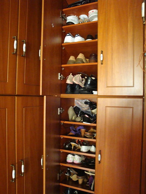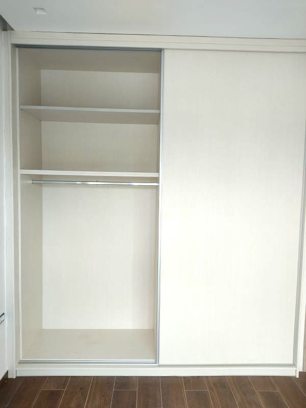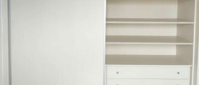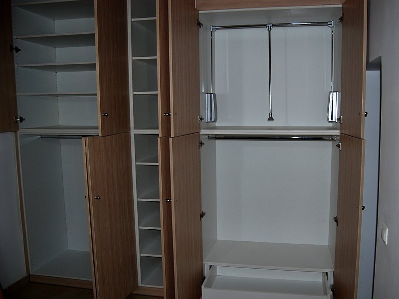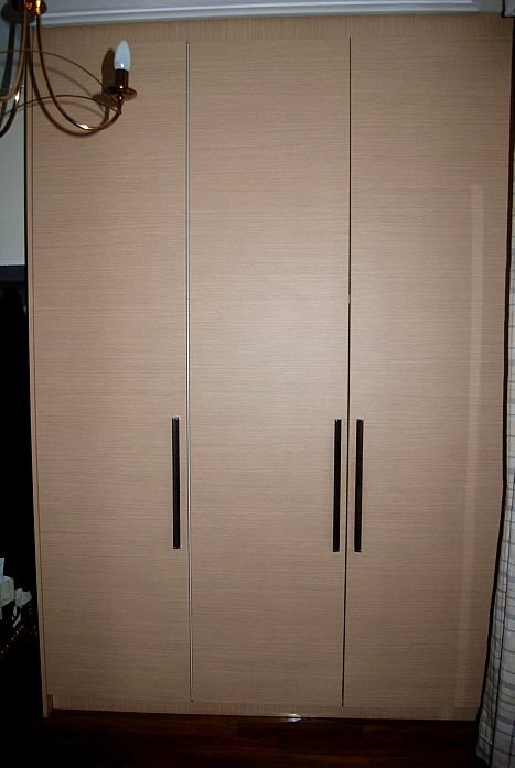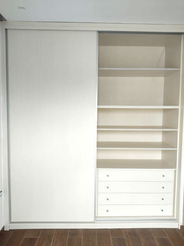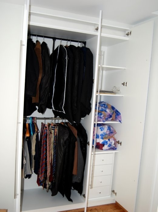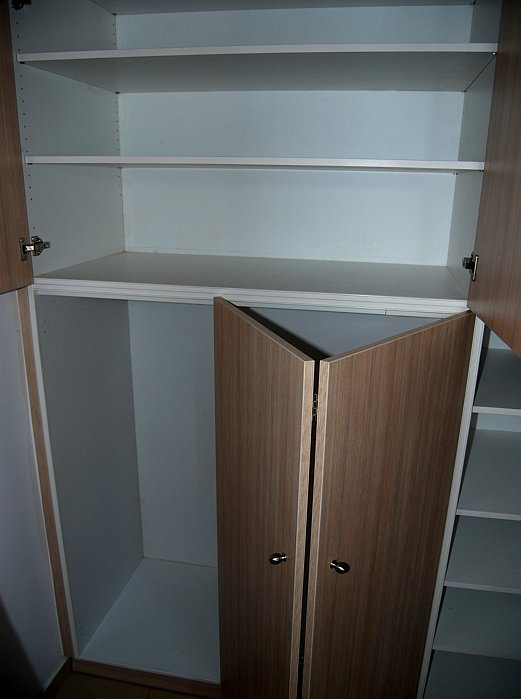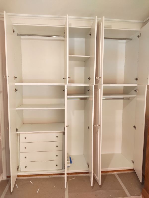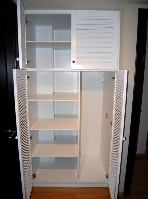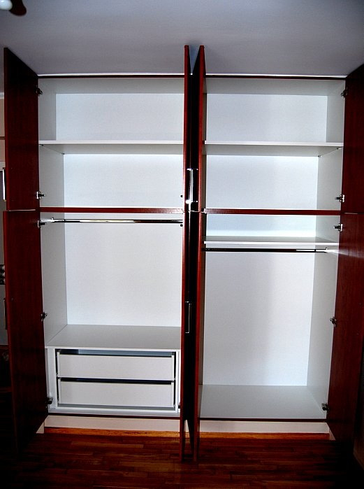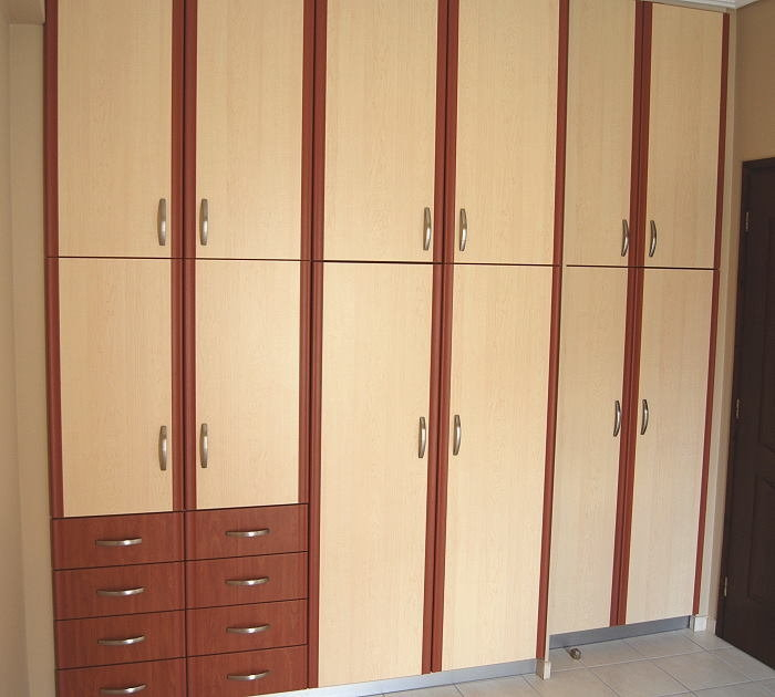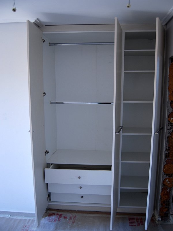 Ντουλάπα από μελανίνη με λευκά κουτιά, inox πόμολα, ραφιέρα παπουτσοθήκη , εσωτερικά συρτάρια, μεντεσέδες και μηχανισμοί συρταριών blum.