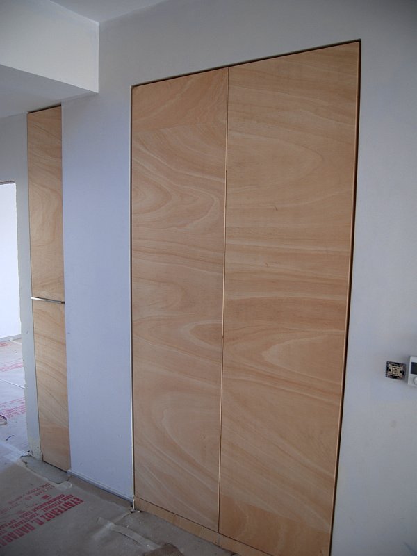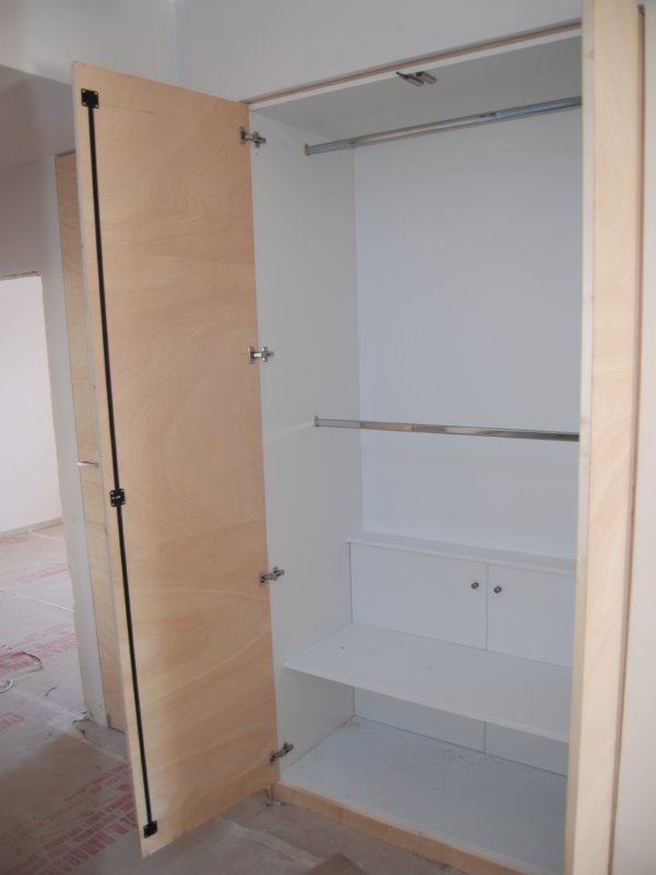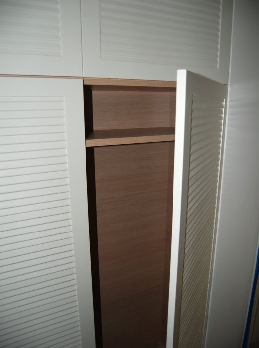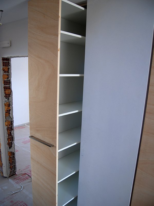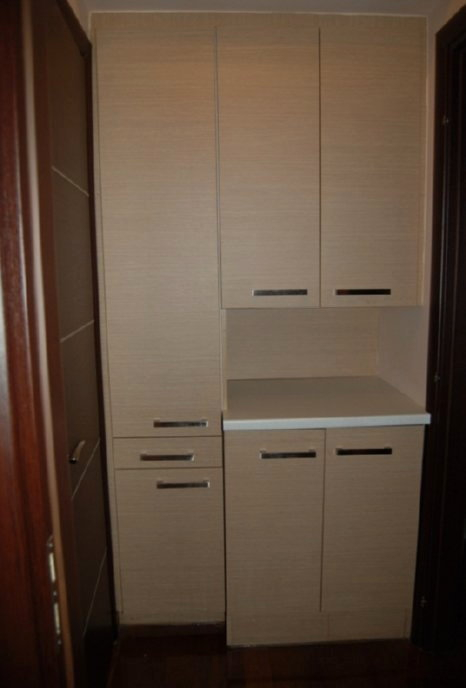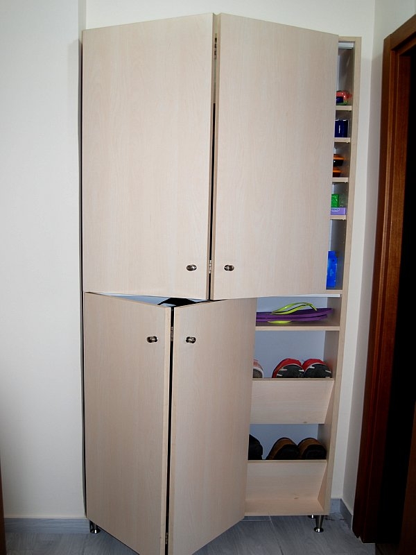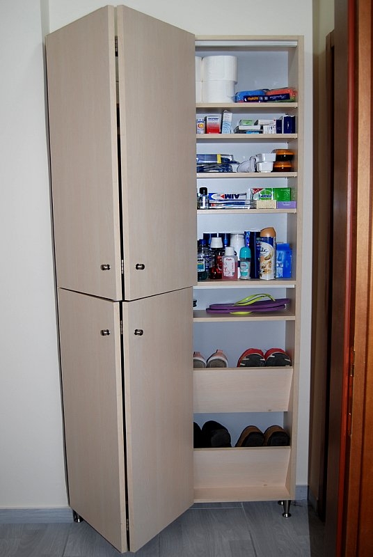 Ντουλάπα διαδρόμου με πορτάκια από πλακάζ για βάψιμο, λευκά κουτιά , συρόμενη παπουτσοθήκη, ράφια, σωλήνες και εσωτερική κρυφή κάλυψη κολεκτέρ.