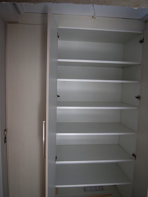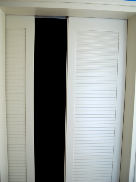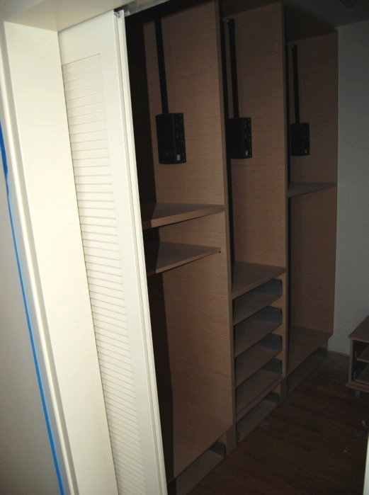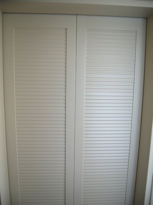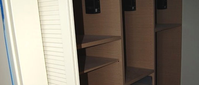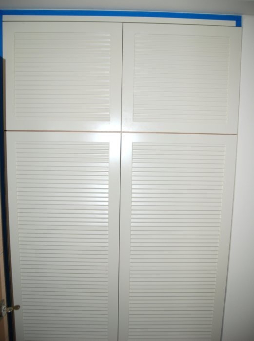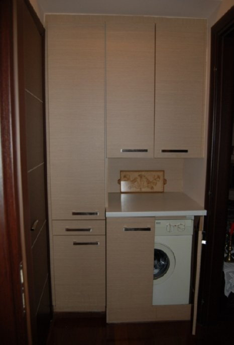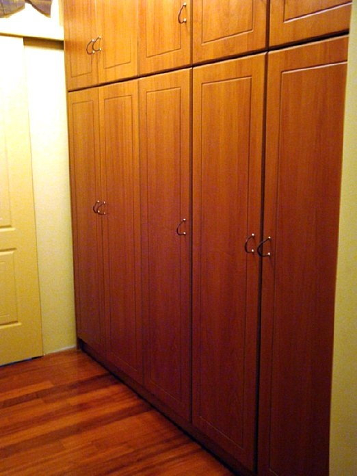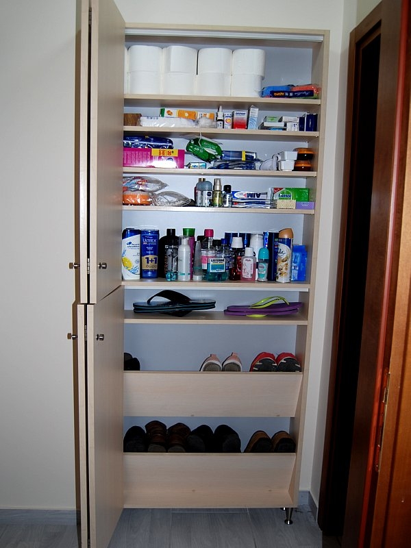 Ντουλάπα διαδρόμου με πορτάκια από πλακάζ για βάψιμο, λευκά κουτιά , συρόμενη παπουτσοθήκη, ράφια, σωλήνες και εσωτερική κρυφή κάλυψη κολεκτέρ.