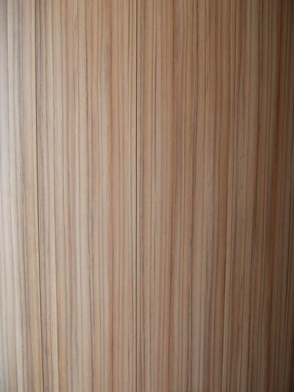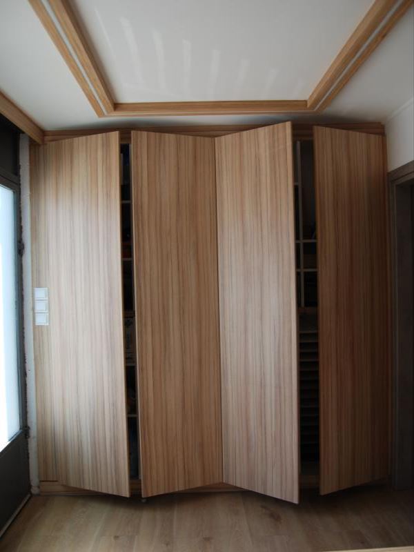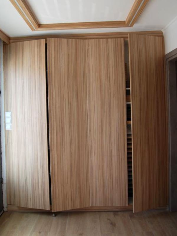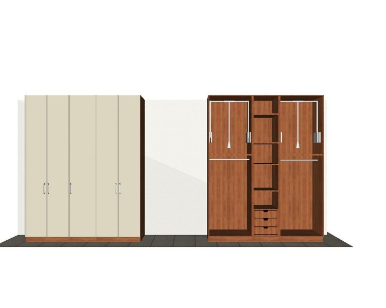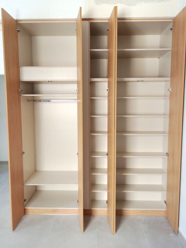 Πεντάφυλλη ανοιγόμενη ντουλάπα από μελαμίνη οξιά, με κάθετα νερά αποτελούμενη από λευκά μελαμινικά κουτιά, τέσσερα συρτάρια, ράφια, inox σωλήνες για τα κρεμαστά και inox πόμολα