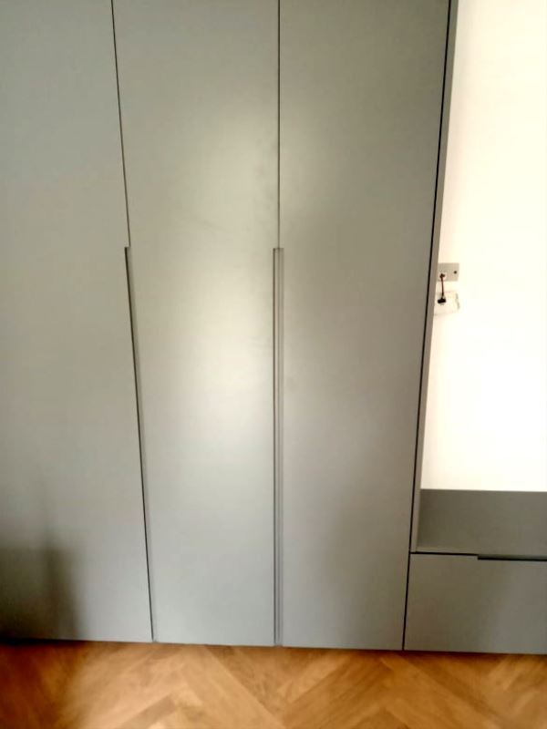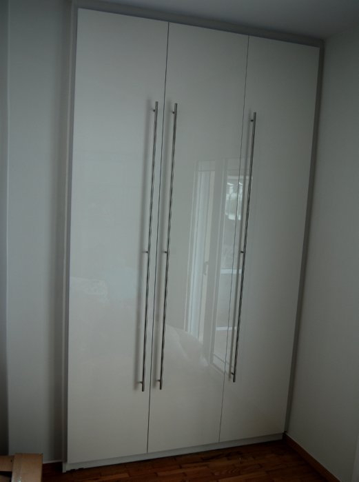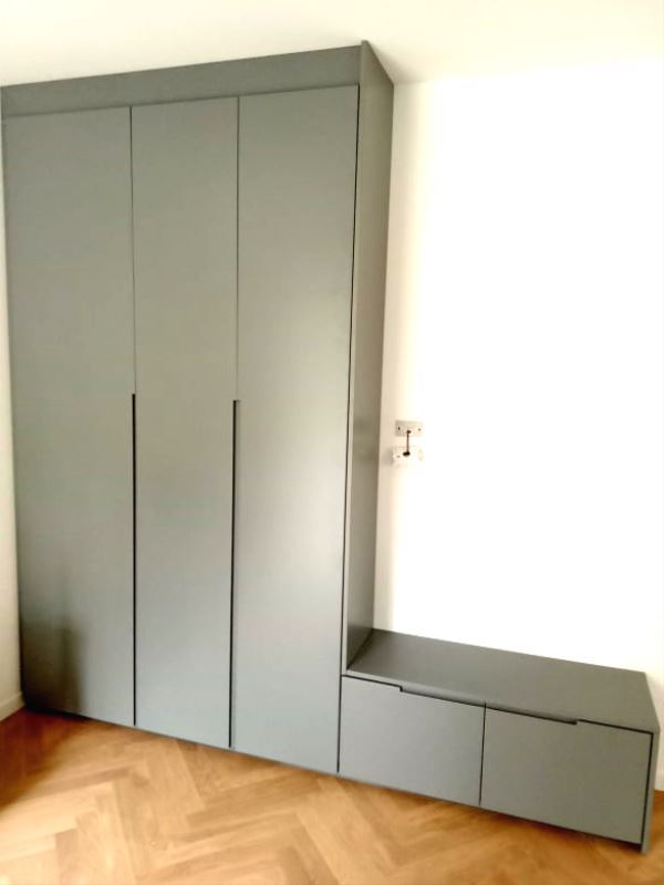 Τρίφυλλη ντουλάπα mdf με ντουλάπι για χρήση παπουτσοθήκης, σε μοντέρνα γραμμή , ανοιγόμενες πόρτες με οικολογική λάκα και σκαφτή κάθετη λαβή (χούφτα), για minimal αισθητικό αποτέλεσμα. Ράφια ρυθμιζόμενα και μεντεσέδες blum.