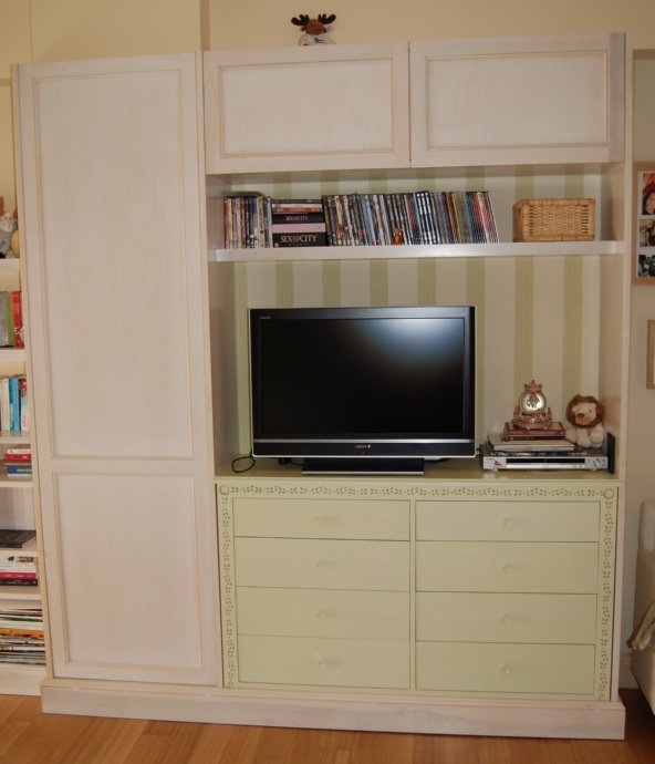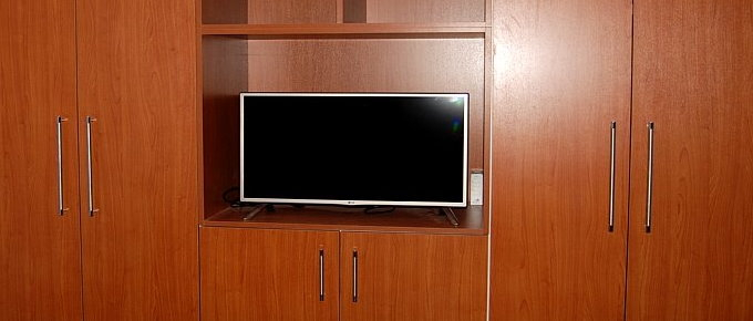 Δίχρωμη μοντέρνα ντουλάπα από μελαμίνη σε 2 αποχρώσεις του ξύλου και της μέντας, με θέση για τηλεόραση αποτελούμενη από εξωτερικά συρτάρια, μονοκόματες πόρτες, μεντεσέδες blum με φρένο και inox πόμολα.