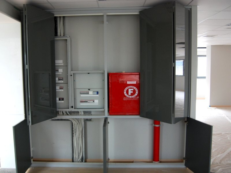 Τετράφυλλη ντουλάπα από έγχρωμη μελαμίνη ΑΚΡΙΤΑΣ με έγχρωμα κουτιά με υποδοχή για air condition, εσωτερική συρταριέρα, σωλήνες και ράφια.
