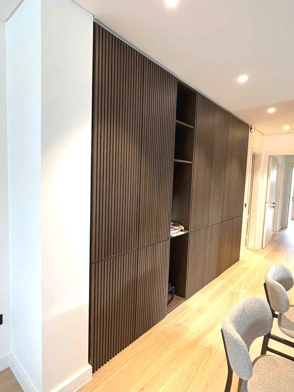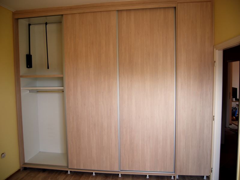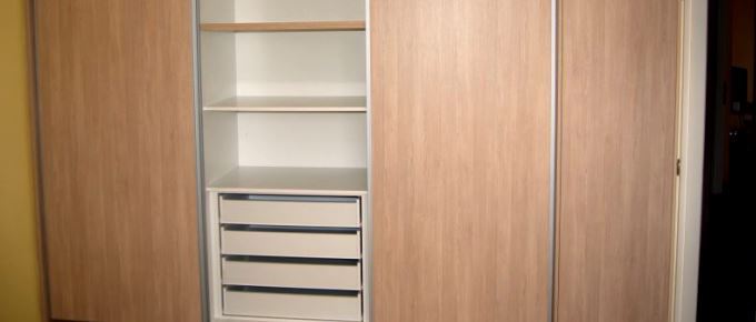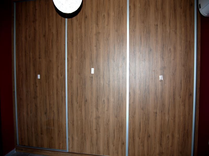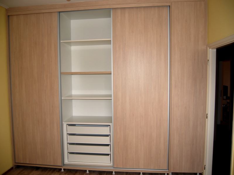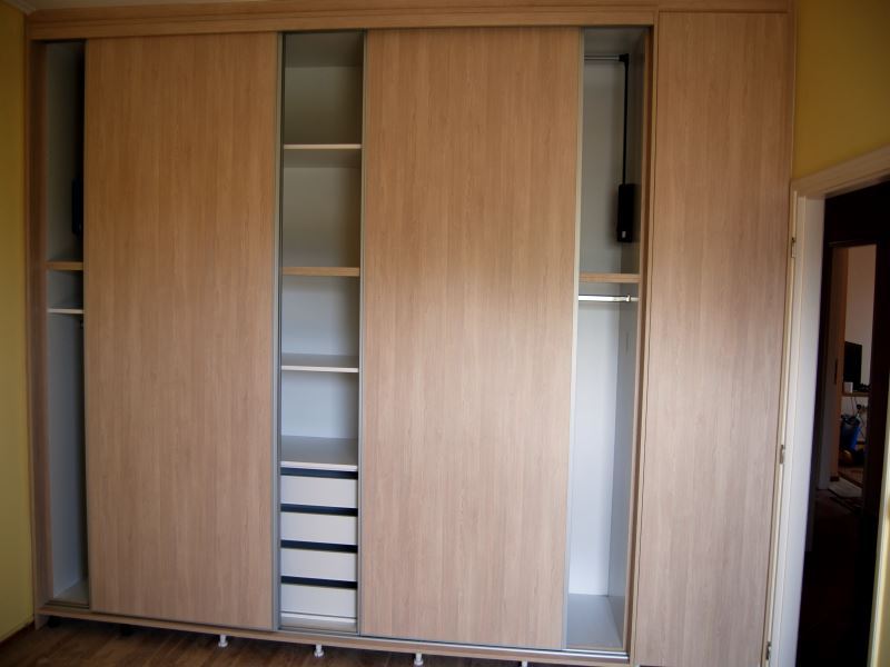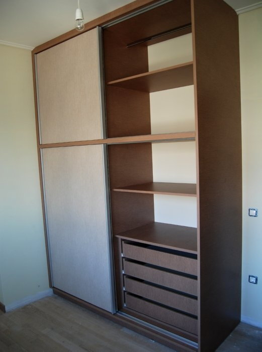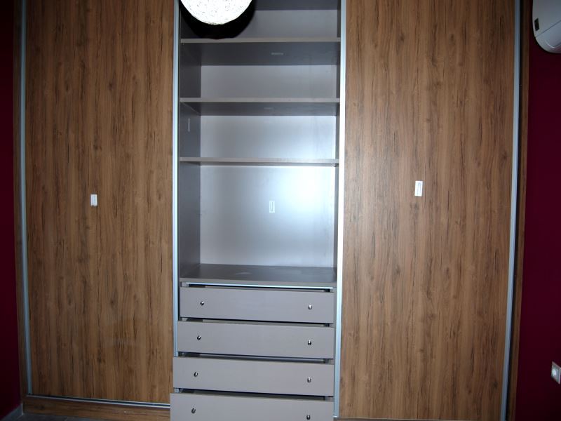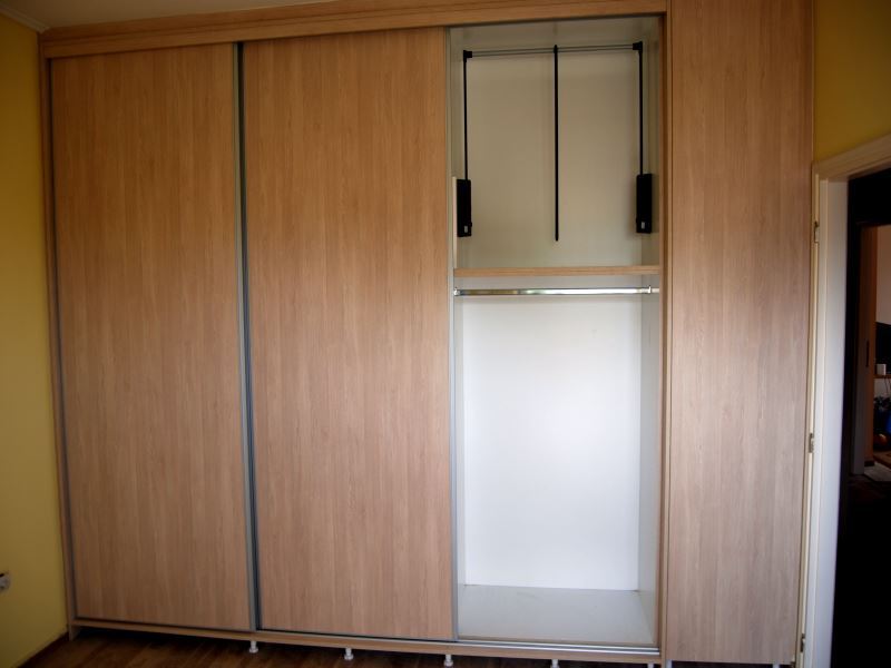 Συρόμενη ντουλάπα με έγχρωμα μελαμινικά πορτάκια AKRITAS σε απόχρωση δρυς ισόβενο, κουτιά 18mm από λευκή μελαμίνη, συρτάρια με μηχανισμούς salice, αλουμινένια πόμολα βέργες, αποτελούμενη από ασανσέρ, σωλήνες , συρτάρια και ράφια.