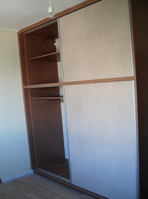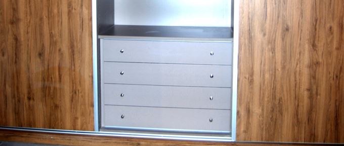 Δίφυλλη συρόμενη ντουλάπα με πορτάκια από έγχρωμη μελαμίνη σε γκρι - μπεζ χρώμα, σε πλαίσιο αλουμινίου, κουτιά από έγχρωμη μελαμίνη αποτελούμενη από 4 συρτάρια, ράφια και σωλήνα για τα κρεμαστά σας.