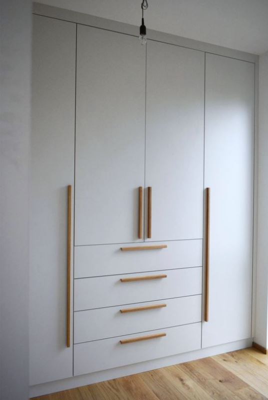 Μοντέρνα ντουλάπα με πορτάκια από έγχρωμη μελαμίνη egger, κουτιά από λευκή μελαμίνη ΑΚΡΙΤΑΣ, πορτάκια ανοιγόμενα χωρίς πόμολα με μηχανισμούς push to open και μεντεσέδες blum 165 °.