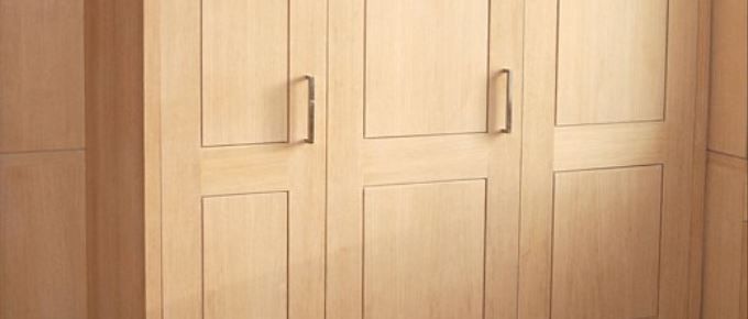 Ντουλάπα από επενδεδυμένο κόντρα πλακέ θαλάσσης με καπλαμά δρυς λουστραρισμένη σε φυσικό χρώμα, σπαστά πορτάκια, τελάρο από μασίφ ξύλο δρυς & ταμπλάδες από κόντρα πλακέ θαλάσσης με καπλαμά δρυς.