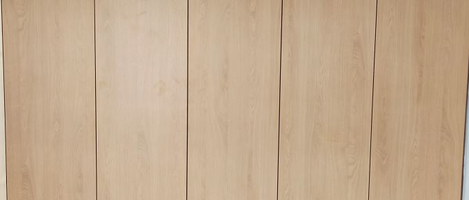 Ανοιγόμενη οκτάφυλλη ντουλάπα από έγχρωμη μελαμίνη ΑΚΡΙΤΑ, με απλές φινετσάτες γραμμές σε απόχρωση δρυς. Κουτιά από λευκή μελαμίνη, συρτάρια εσωτερικά με φρένο, βραχίονες και ράφια.