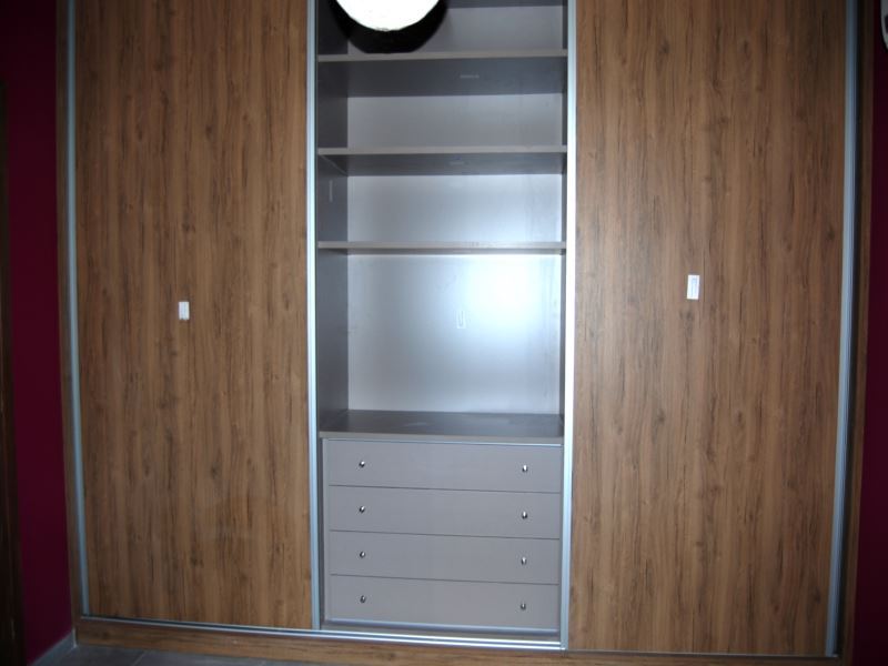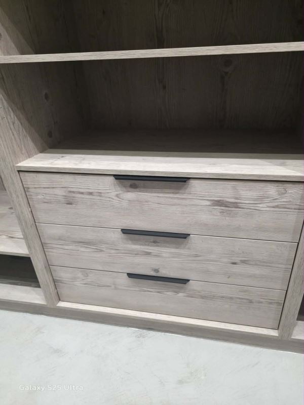 Ντουλάπα με 3 συρόμενες πόρτες από έγχρωμη ανάγλυφη μελαμίνη ρουστίκ, κουτιά έγχρωμης μελαμίνης, αποτελούμενη από 4 συρτάρια με φρένο, ράφια 25 mm και inox σωλήνες.