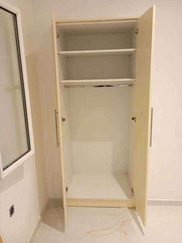 Ντουλάπα με προεξοχή σε εσοχή τοίχου για περισσότερο χώρο στην ντουλάπα. Πόρτες από μπεζ μελαμίνη μονοκόματες , κουτί από λευκή μελαμίνη, σωλήνα inox για τα κρεμαστά ρούχα και πόμολα μπάρες