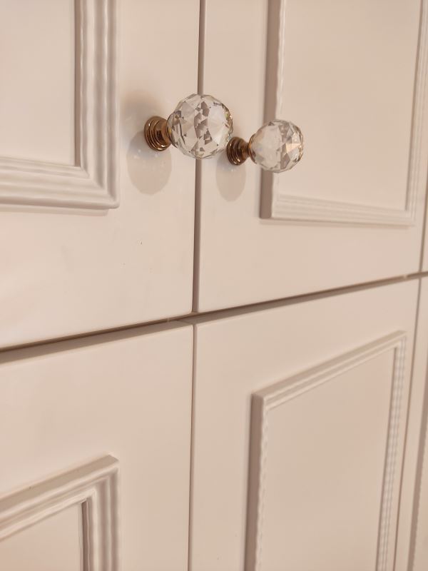 Ξύλινη κλασική ντουλάπα με πορτάκια από κόντρα πλακέ θαλάσσης με διακοσμητικά κορδόνια και κρυστάλλινα πόμολα, βαμμένη με οικολογική λάκα, αποτελούμενη από κουτιά μελαμίνης, εσωτερικά συρτάρια, ράφια , σωλήνες και μεντεσέδες blum.
