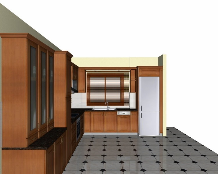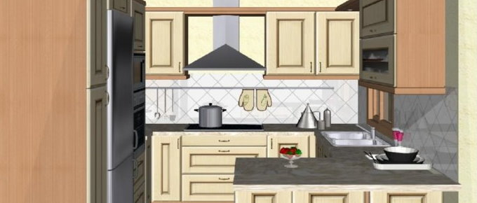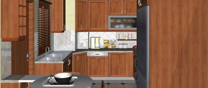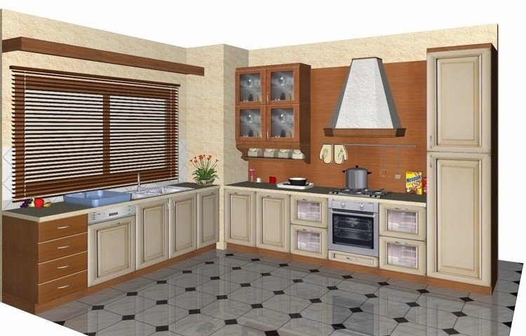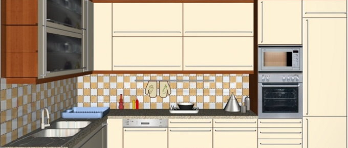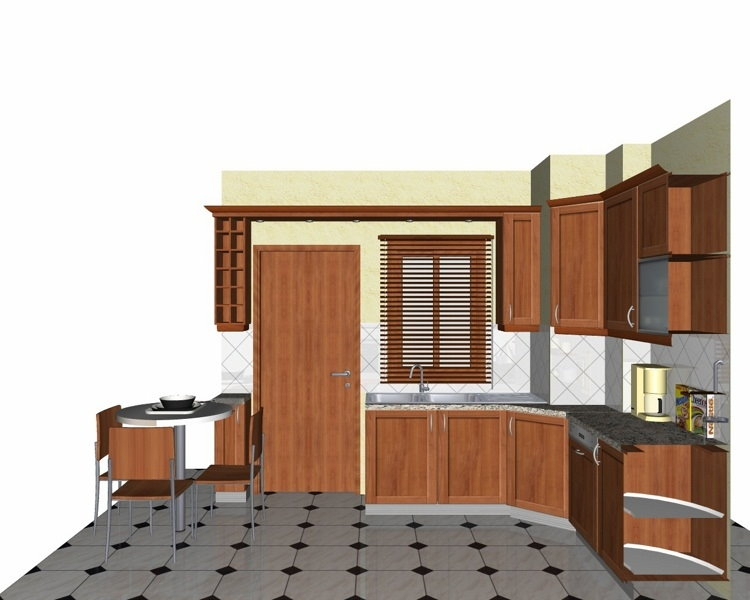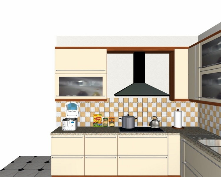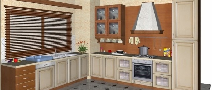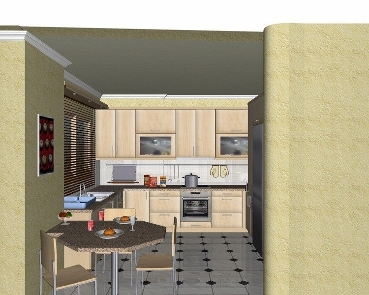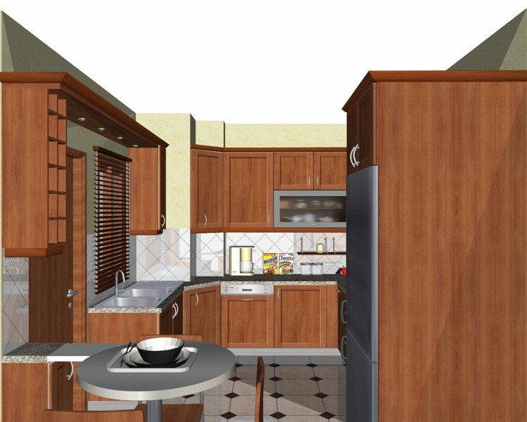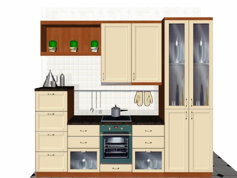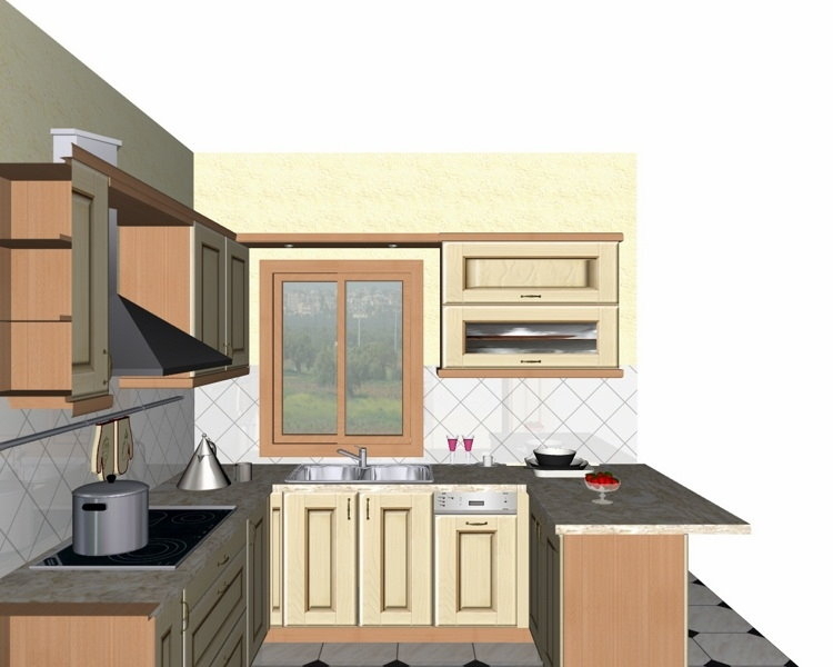 Προοπτικό κουζίνας από εκρού βακελίτη & κουτιά ντουλαπιών από μελαμίνη μηλιά, αποτελούμενη από κορνίζα και φάσα μηλιά, βιτρίνες ανοιγόμενες άνω, πορτάκια, συρτάρια και βαγονέτα.