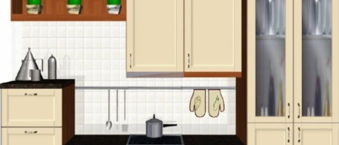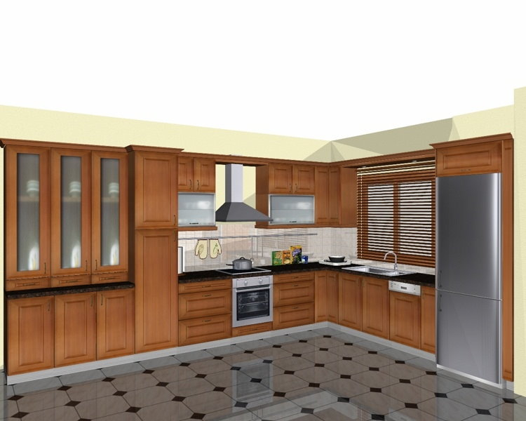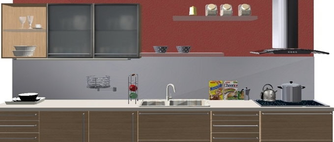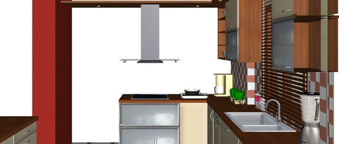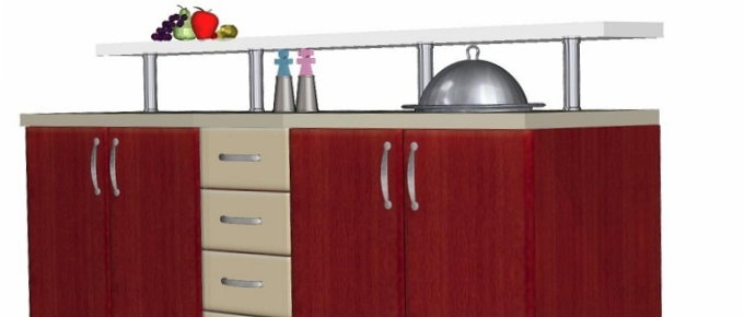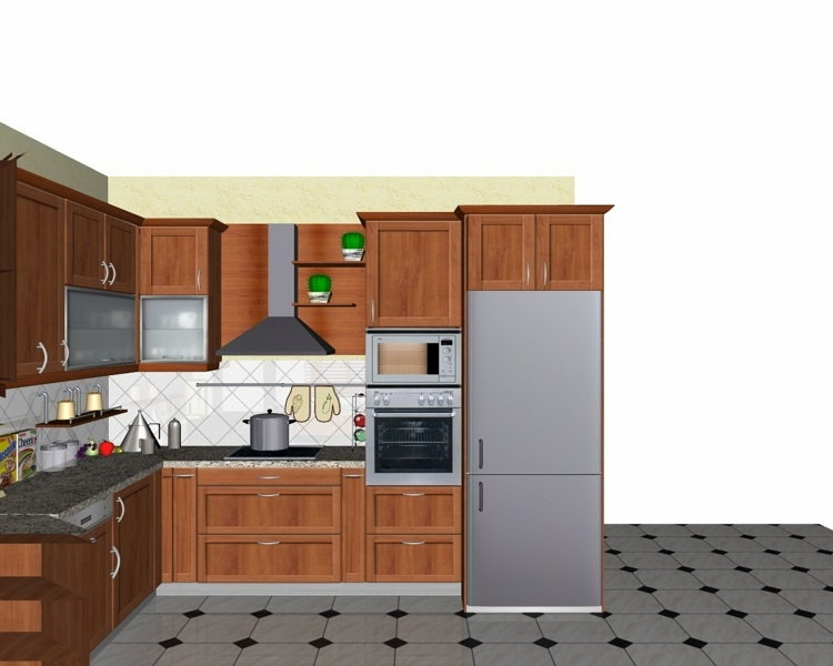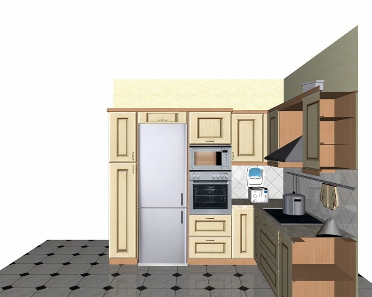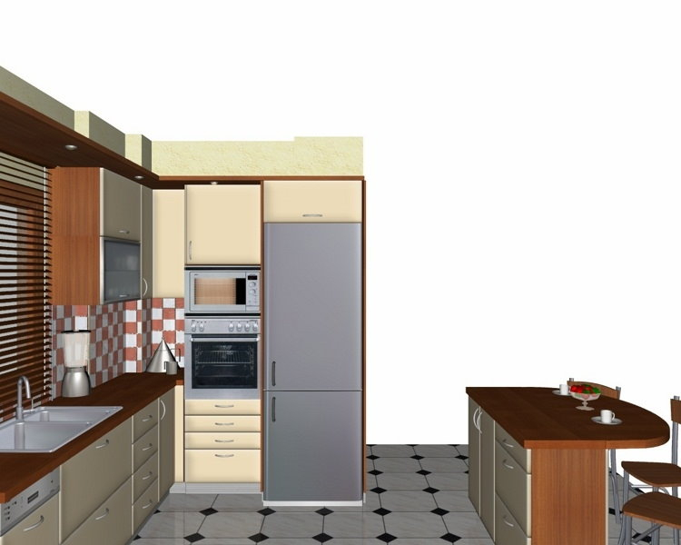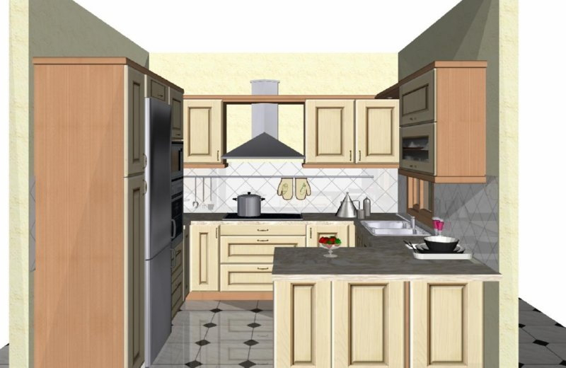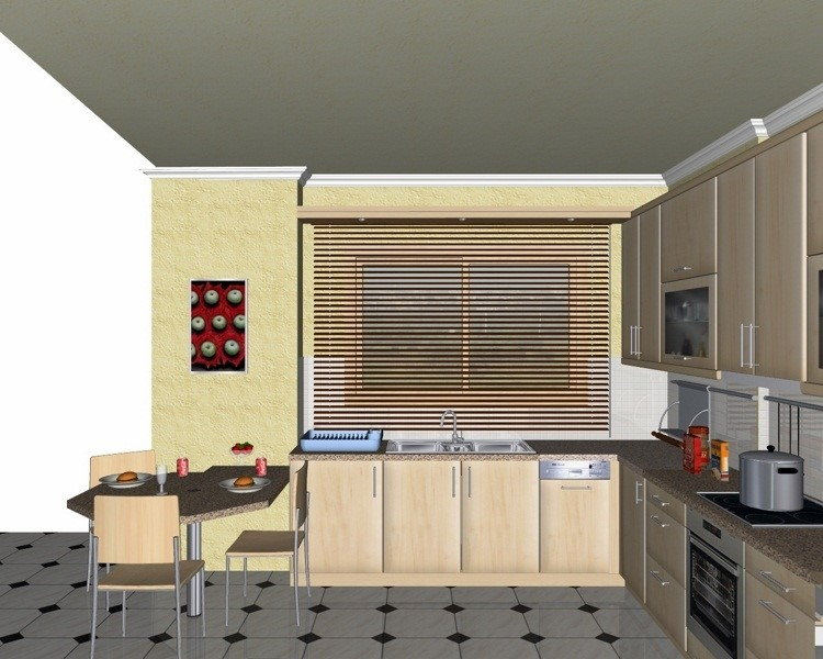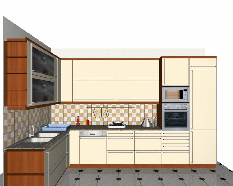 Προοπτικό κουζίνας από εκρού βακελίτη & κουτιά ντουλαπιών από μελαμίνη μηλιά, αποτελούμενη από κορνίζα και φάσα μηλιά, βιτρίνες ανοιγόμενες άνω, πορτάκια, συρτάρια και βαγονέτα.
