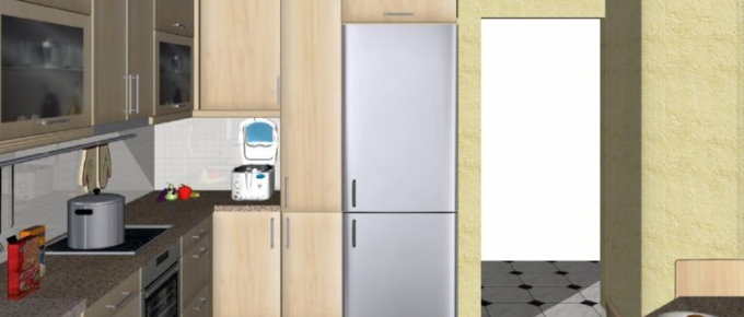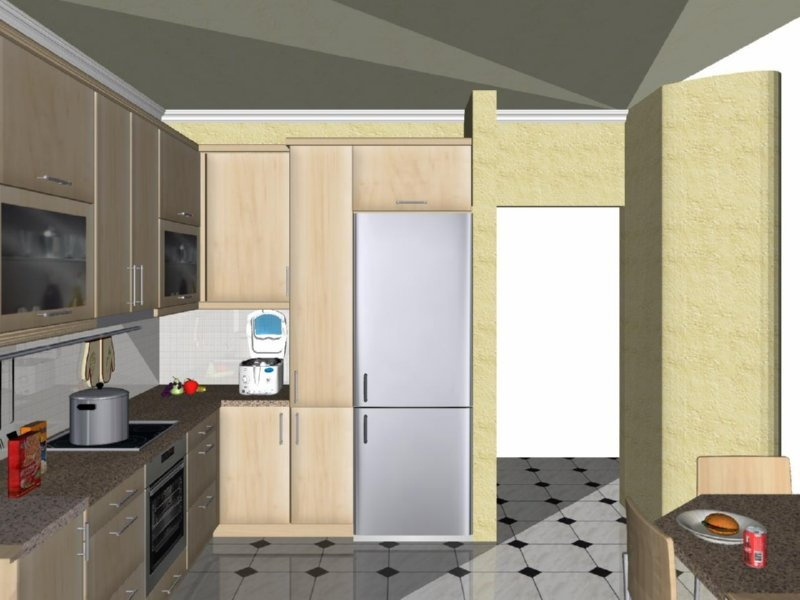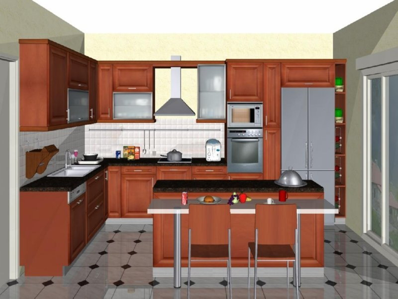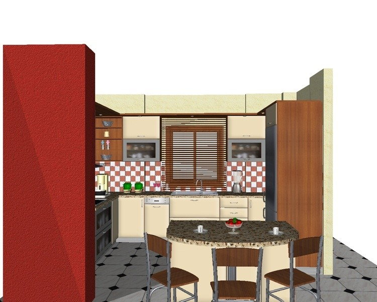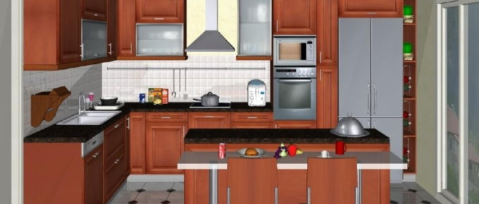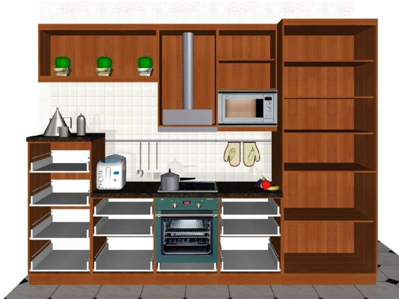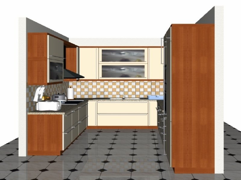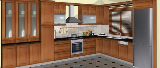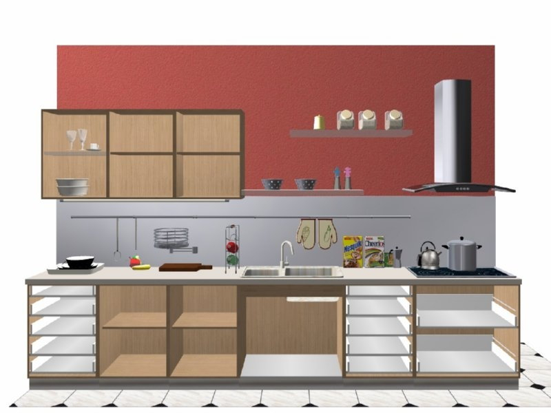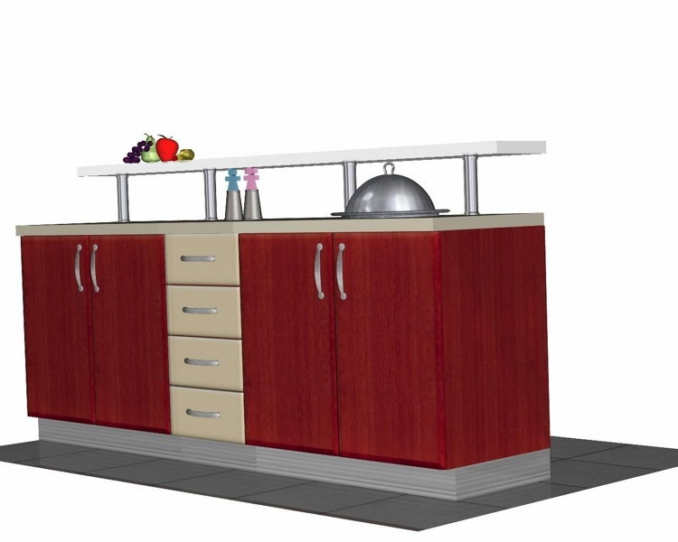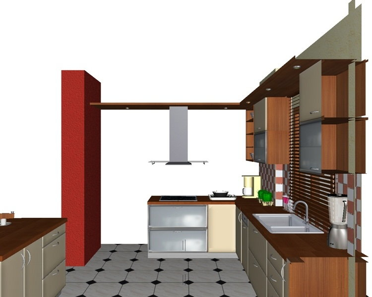 Προοπτικό κουζίνας από εκρού βακελίτη & κουτιά ντουλαπιών από μελαμίνη μηλιά, αποτελούμενη από κορνίζα και φάσα μηλιά, βιτρίνες ανοιγόμενες άνω, πορτάκια, συρτάρια και βαγονέτα.