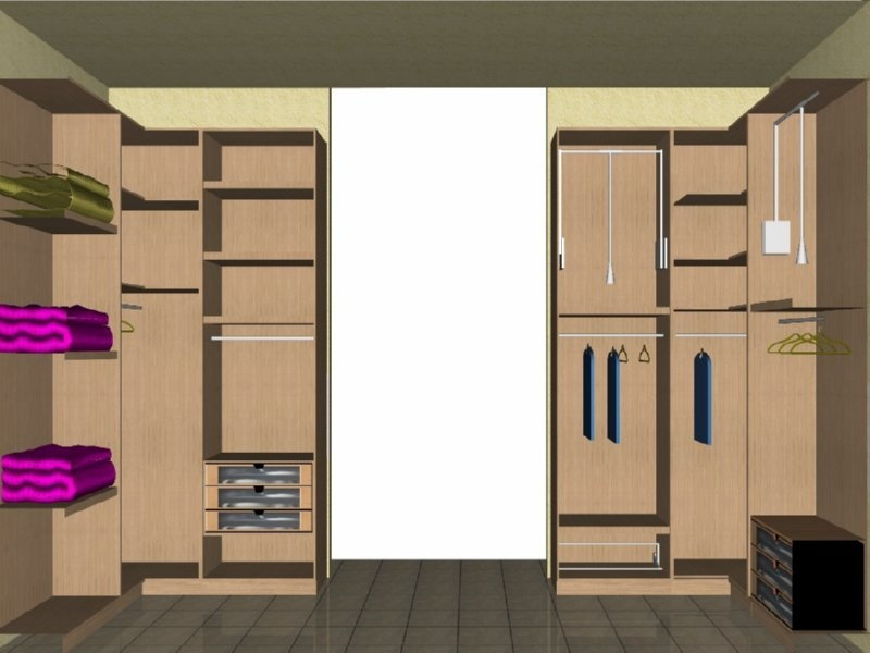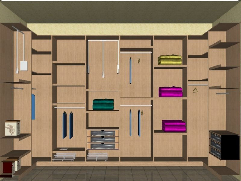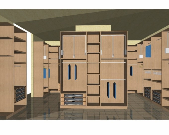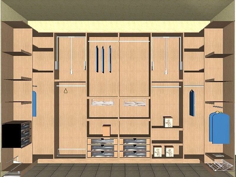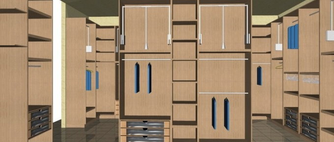 Δωμάτιο ιματιοθήκης αποτελούμενο από ξύλινα ράφια, βραχίονες, ντουλάπια, συρόμενα βοηθητικά καλαθάκια, ασανσέρ και συρταριέρες με πρόσοψη από plexiglass.