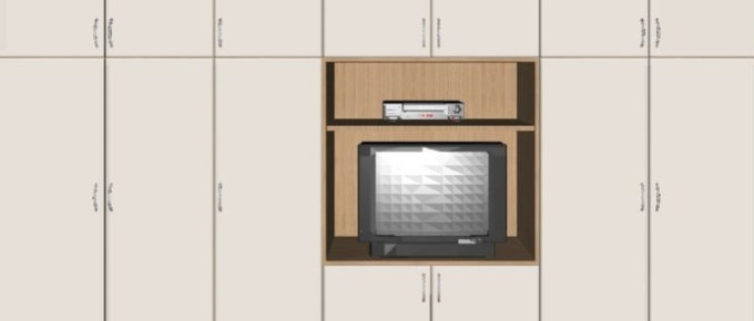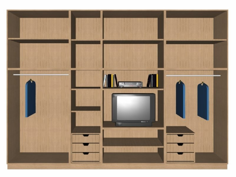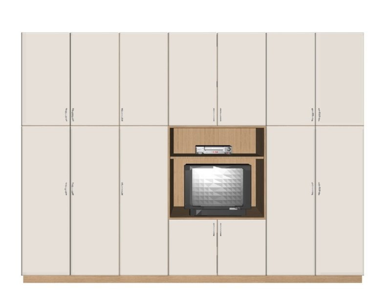 Προοπτικό σχέδιο δίχρωμης ντουλάπας με ανοιγόμενα βακελιτικά πορτάκια, κουτιά από μελαμίνη, ανοιχτά ράφια για tv και video από μελαμίνη οξιά και φάσα από οξιά.